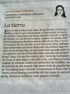Era un día verde y azul, lleno de horizonte. Puede que fuera eso lo que compramos, el horizonte, los montes verdes, haciendo una línea sobre el azul de la tarde de verano. La tía Elvira lo sabía. Aquello se vendía solo. No le compramos la tierra sino el cielo de ese día. Y la luz. Es curioso. No ha variado la luz en veinte años, aunque haya observado mil luces distintas. Los árboles han crecido, yo he envejecido, mi escritura está cansada, pero la luz aparece con la misma decisión cada día tras el monte del Gato. Era un día verde y azul, lleno de horizonte. Yo tenía el pelo negro y la piel clara, tan blanca como cuando de niña mi madre me pellizcaba las mejillas. Salía colorete de sus manos, rojo como el sol de aquella tarde. Una garza pasó volando. Compramos la finca. Dio la Tierra varias vueltas alrededor del Sol antes de que otra garza, mientras tendía la ropa, pasara volando.
