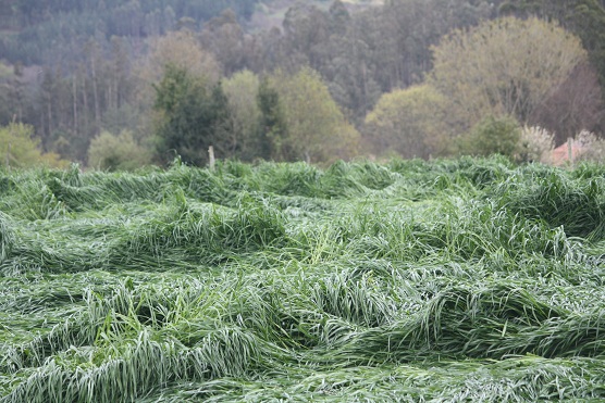 Se dice de la hierba alta y los cereales tumbados por la acción conjunta del agua y del viento dejando remolinos y hondonadas como si hubiera entrado a sestear el ganado. También para el animal echado a descansar.
